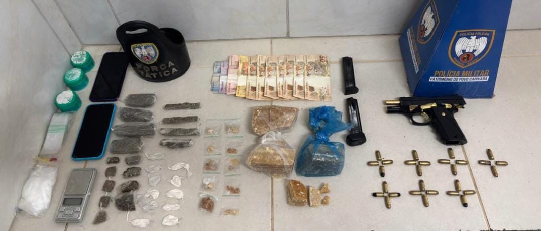 No quintal, os militares encontraram uma pistola calibre .380 com dois carregadores e 28 munições, além de uma sacola arremessada por uma pessoa contendo pedras de crack e material para embalo. Dentro da casa, as buscas resultaram na apreensão de maconha, cocaína, mais porções de crack e R$ 387 em dinheiro, todos prontos para a comercialização.