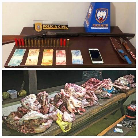 Durante as buscas, os policiais civis e militares encontraram na casa do suspeito uma espingarda calibre 24, duas munições intactas e 15 prontas para recarga, além de R$ 1.240,00 em dinheiro, cerca de 120 quilos carne sem origem comprovada, um veículo cheio de sangue ainda fresco, além de material para corte de animais.