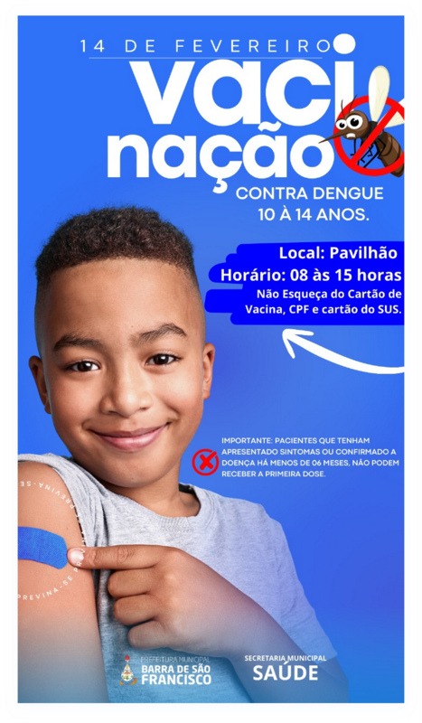 A Prefeitura de Barra de São Francisco, por meio da Secretaria Municipal de Saúde (Semus), informa a realização da campanha de vacinação contra a dengue, destinada a crianças e adolescentes de 10 a 14 anos.